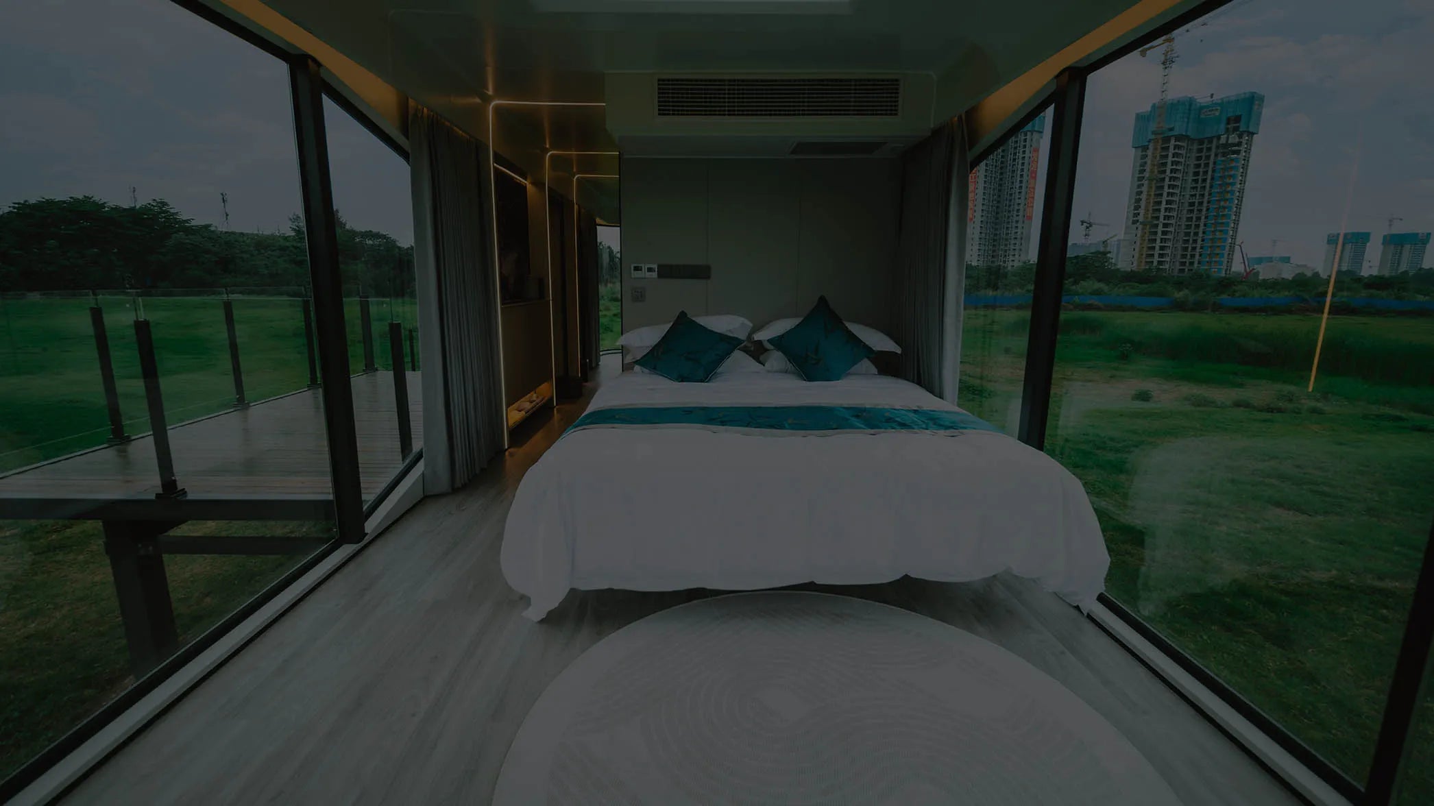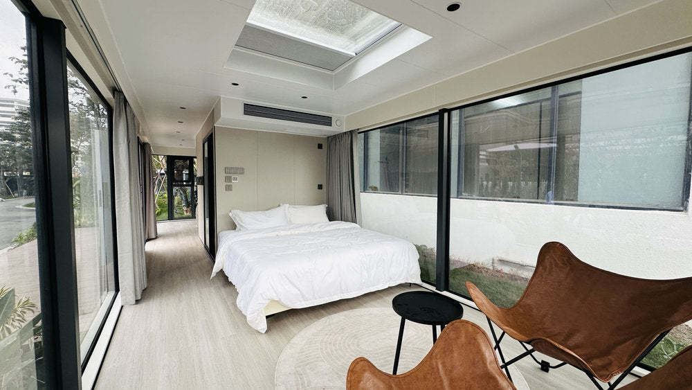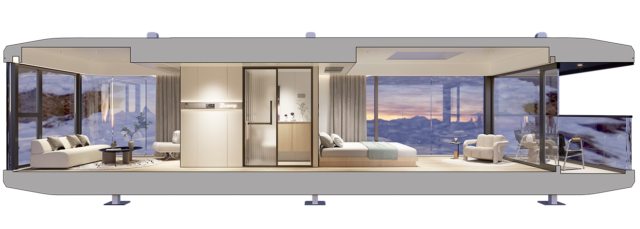 El precio incluye el sistema modular integrado de techo y pared, suelo de pizarra moldeado, revestimiento de madera compuesta, sistema de fontanería y electricidad integrado, iluminación completa, aire acondicionado, cortinas motorizadas inteligentes, y todos los accesorios de baño (lavabo, espejo, estantes). Consulta con nosotros para opciones de personalización.