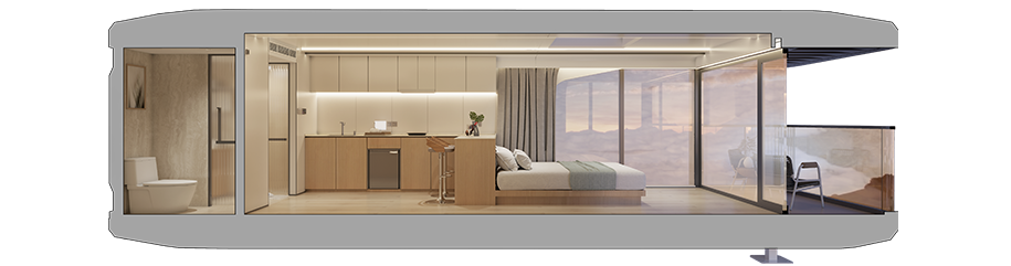 El precio incluye el sistema modular integrado de techo y pared, suelo de pizarra moldeado, revestimiento de madera compuesta, sistema de fontanería y electricidad integrado, iluminación completa, aire acondicionado, cortinas motorizadas inteligentes, y todos los accesorios de baño (lavabo, espejo, estantes). Consulta con nosotros para opciones de personalización.